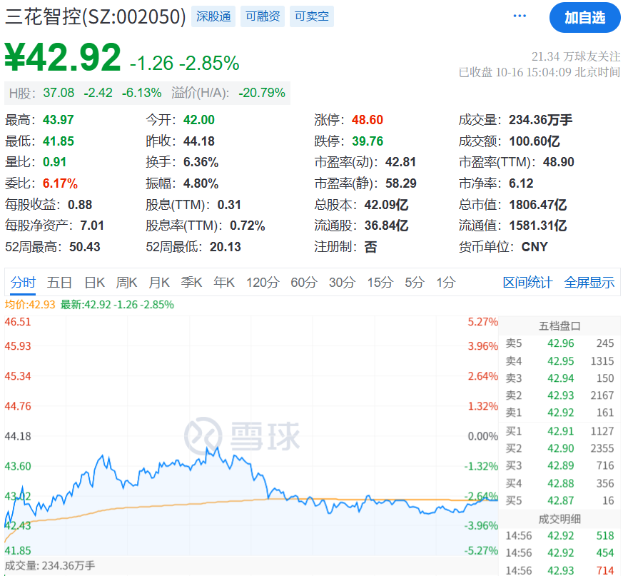 截至当日下午股市收盘,三花智控A股收于44.18元/股,总成交额119.80亿元,总市值达到1859.50亿元;港股报39.52港元/股,涨幅高达12.98%,总市值为1646.31亿港元。