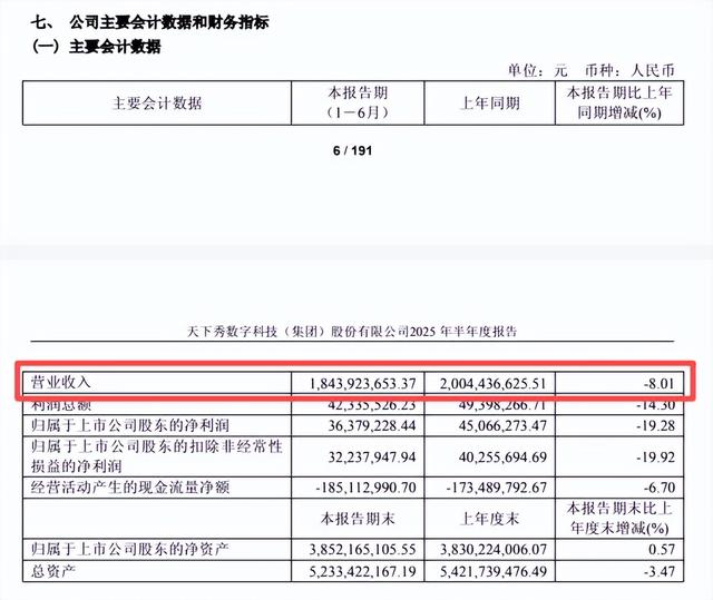 2025年上半年,天下秀实现营业收入18.44亿元,同比下滑8.01%,远超行业平均水平;同期归属于上市公司股东的净利润为3,637.92万元,同比大幅下降19.28%。