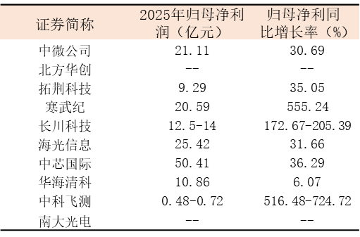 其中,中微公司、拓荆科技、海光信息、中芯国际2025年归母净利同比增速均在30%以上,寒武纪首次盈利摘“U”、年度归母净利高超555%,长川科技、中科飞测归母净利同比增长率也均预达3位数。