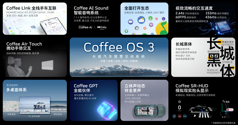 长城汽车全栈自研的第三代智慧空间系统Coffee OS 3,是全球首个基于多桌面、多屏互动的AI智慧空间,配合座舱空间百变组合性,全面满足了基于车内全体用户的个性化需求;