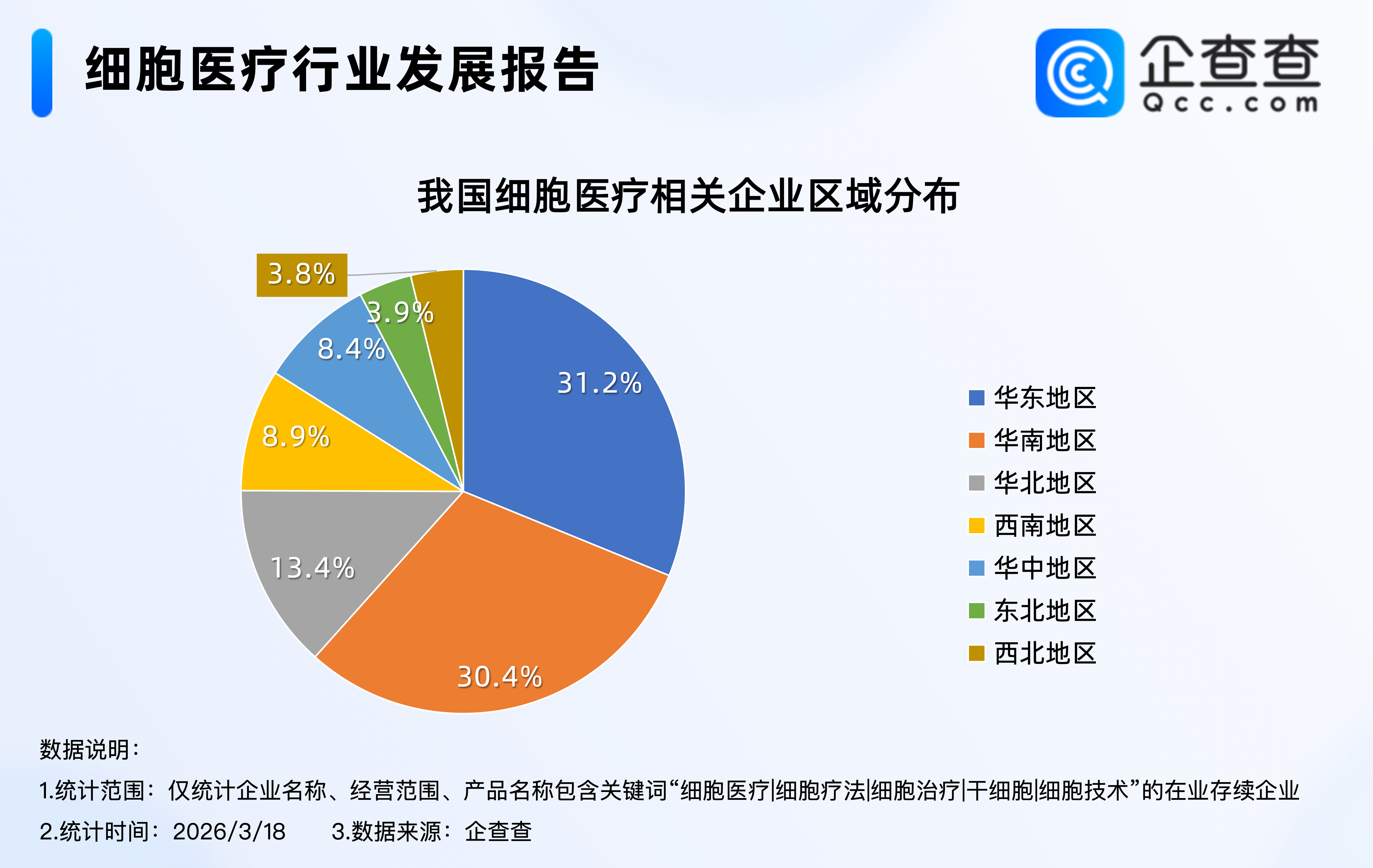 企查查数据显示,截至2026年3月18日,我国现存14.9万家细胞医疗相关企业,区域分布上,华东、华南地区最多,分别占比31.2%、30.4%,东北、西北地区相对较少,分别占比3.9%、3.8%。