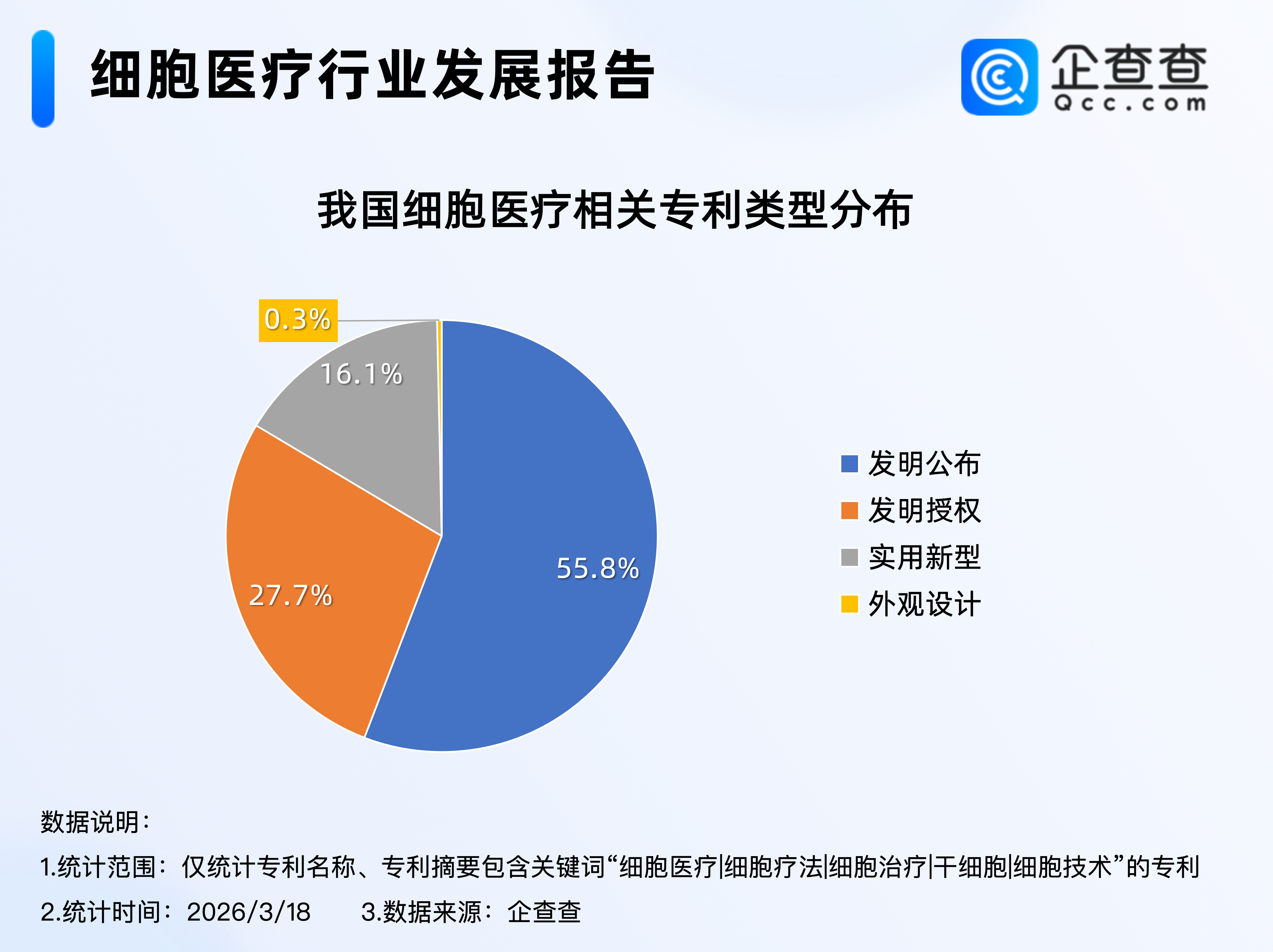 企查查数据显示,截至2026年3月18日,我国细胞医疗相关专利达3.2万项。专利类型上以发明公布为主,占比55.8%,其次是发明授权,占比27.7%,实用新型占比16.1%。
