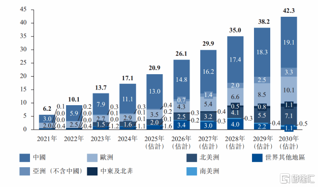 数据显示,当前全球新能源汽车的渗透率仍处于较低水平,2024年德国、美国、日本的电动车渗透率分别为18%、9.6%和约3%。后续,随着新能源汽车技术及性能不断提升、各国政策支持下,预计到2030年新能源乘用车全球销量将达到4230万辆,2024年至2030年的复合年增长率为16.3%,渗透率有望升至47.0%。