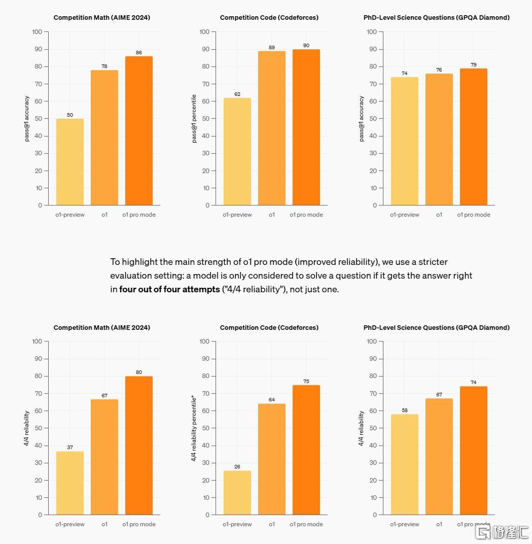OpenAI表示,与o1和o1-preview版本相比,o1 pro模式在数学、科学和编码的机器学习基准测试中表现更好。
