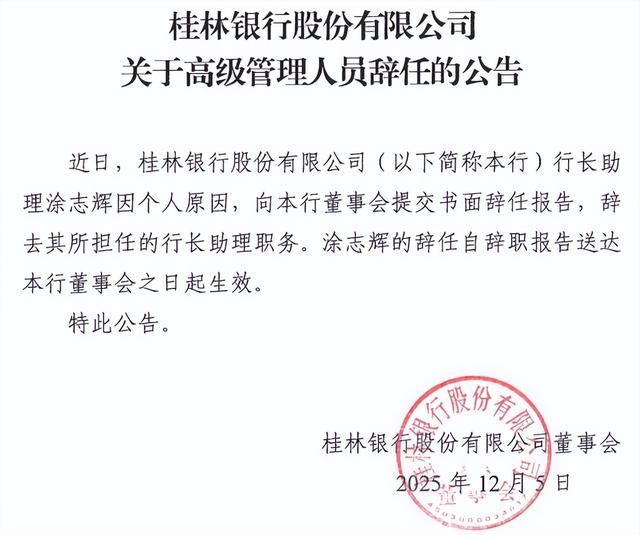 近日,桂林银行发布公告称,行长助理涂志辉因个人原因辞任。这已是该行自2025年4月前董事长吴东被查以来,第五次重要高管变动。