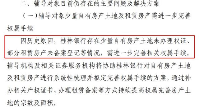 2025年4月,中信证券向广西证监局报送了辅导工作进展报告(第七期)。辅导报告指出,因历史原因,桂林银行存在少量自有房产土地未办理权证、部分租赁房产未备案登记等情况,需进一步完善相关权属手续;另一方面,桂林银行在日常经营中涉及若干法律诉讼,主要为银行在信贷等业务正常开展过程中作为原告发生的未决法律纠纷。