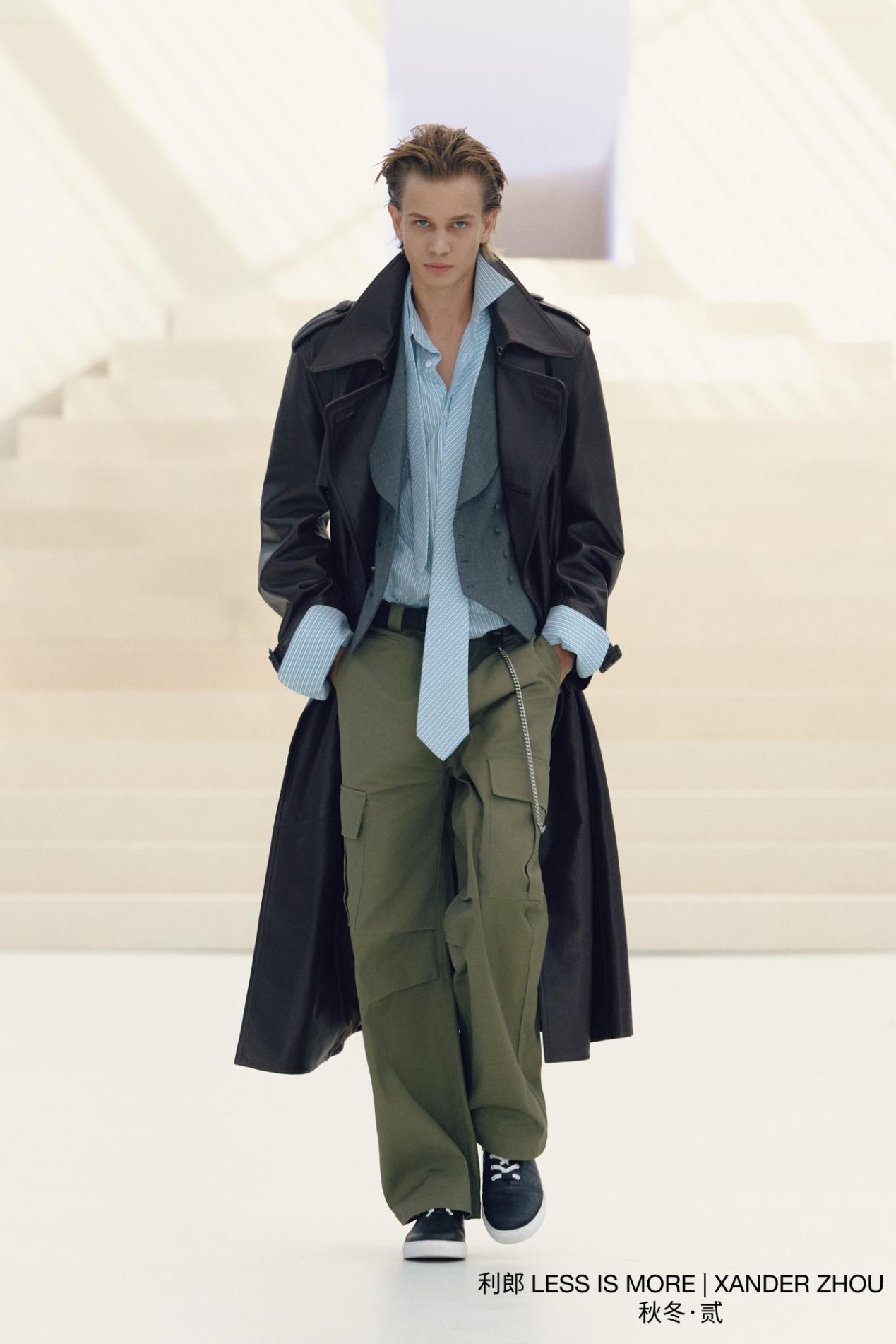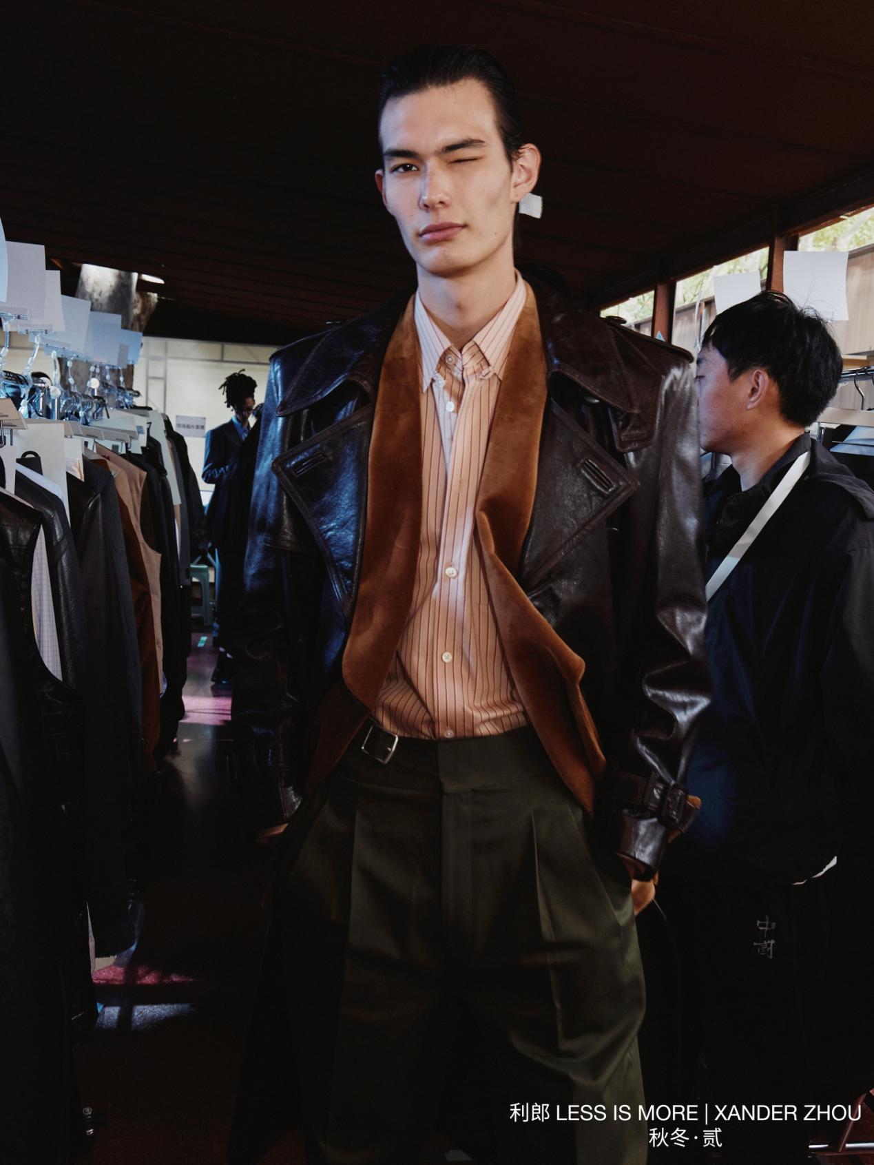 “没有为了‘设计’而设计,更关心的是,这些服装如何丰富地表达出都市男性在现实中的多重状态。”在「From Stone to Structure|由石至形」系列中,设计师周翔宇XANDER ZHOU并未追求形式上的设计,而是更聚焦于服装如何呈现都市男性的多元形象。其将跨文化视觉与对男装体系的当代解读融入设计逻辑中,并转化为对服装轮廓、比例、材质的表达。西装、大衣、皮革衬衫与针织层叠构成了“理性衣橱”的骨架,比例与结构之间形成自洽的秩序感。