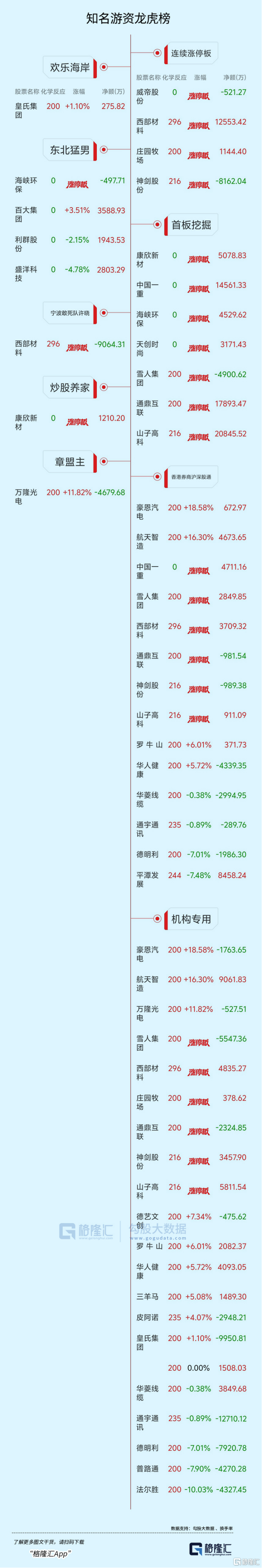 龙虎榜中涉及机构专用席位的个股中,单日净买入额前三为航天智造、山子高科、西部材料,分别为9061.83万、5811.53万、4835.26万。