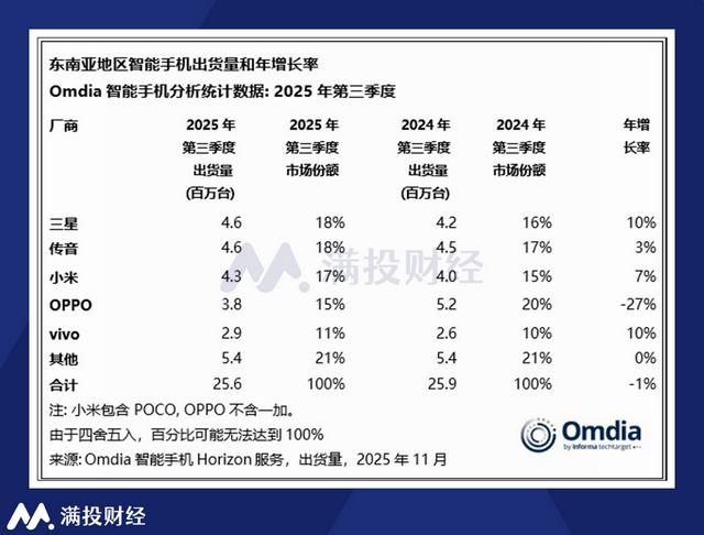 其他新兴市场的竞争也呈现白热化。在巴基斯坦、孟加拉国等南亚市场,小米、三星持续加码,价格战导致传音毛利率进一步下滑;东南亚市场出货量连续第三个季度出现同比下跌,三星排名重回第一,传音市占率逼近三星但尚未形成优势,且小米、OPPO、VIVO等几家国产品牌紧随其后,各有所长。