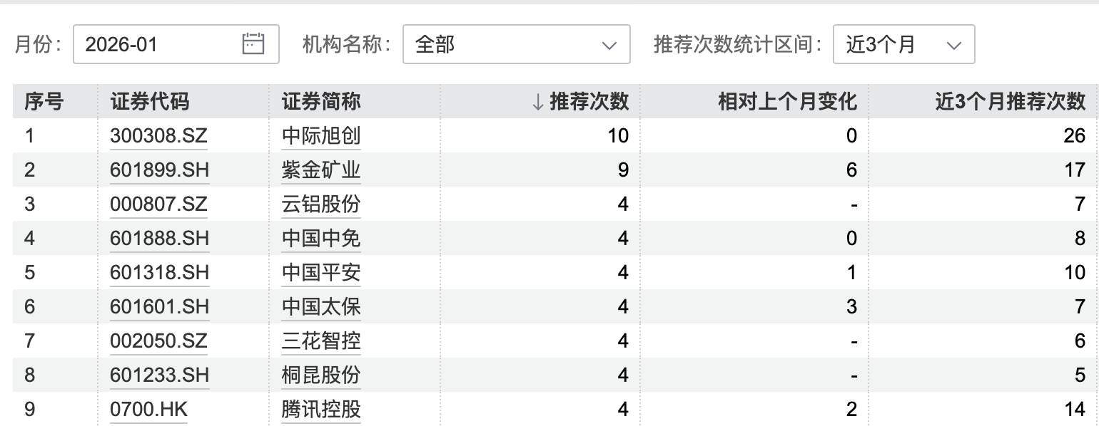 其中,中际旭创、紫金矿业被推荐次数位居前两位,分别同时被10家、9家券商同时推荐。这两只金股的累计推荐次数同样靠前,近三个月分别被推荐26次、17次。