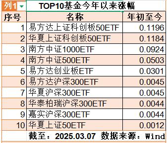 数据显示,截止3月7日收盘,上述规模TOP10基金产品中,2025年以来涨幅前2名的依然是两只上证科创板50ETF,其中,易方达上证科创板50ETF净值增长11.96%,华夏上证科创板50ETF净值增长11.84%,可谓强者恒强。