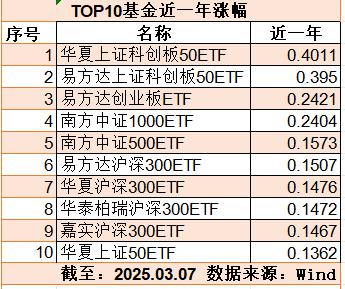 数据显示,截至3月7日,近1年涨幅前3名的基金,第一名是华夏上证科创板50ETF,净值增长40.11%;第二名是易方达上证科创板50ETF,净值增长39.5%;第三名是易方达创业板ETF,净值增长24.21%。