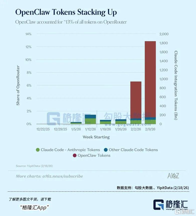 数据表明,Token的持续增长已然是对算力需求的正反馈,特别是当今年Openclaw出来后,除了PC端侧,2月还全面适配了ios包括手机、手表,在OpenRouter上的Token调用量以惊人的速度在增加。