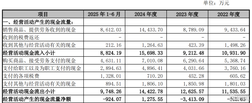 此外,公司的经营性现金流并不乐观,2022年、2023年及2025年1-6 月录得负值,主要系公司销售环节票据结算比例较高,且收现规模低于付现规模所致。