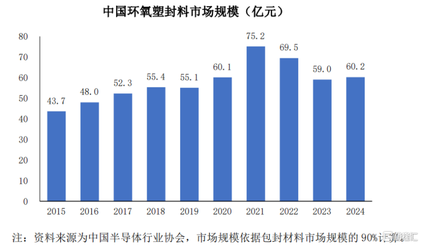2024年,环氧塑封料行业开始触底反弹,当年中国环氧塑封料市场规模约为60.2亿元,同比增长2.0%。