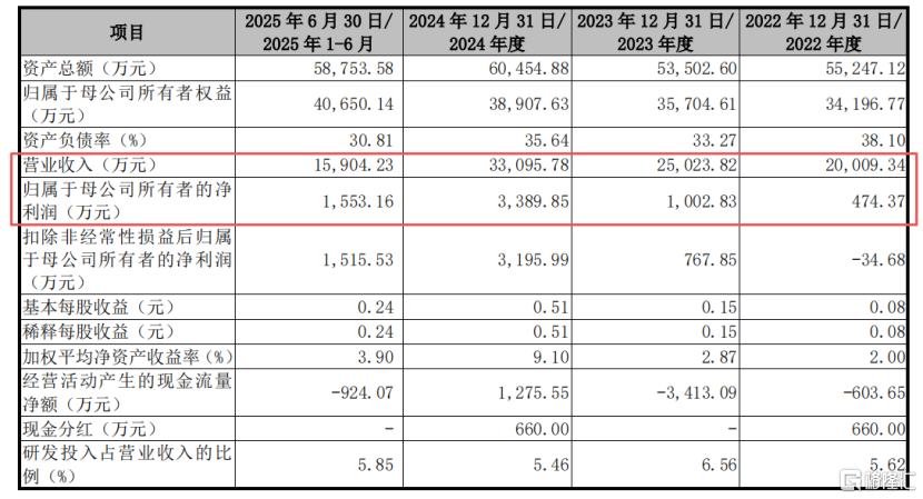 2022年、2023年、2024年及2025年1-6月(报告期),公司营业收入分别为2亿元、2.5亿元、3.31亿元、1.59亿元,公司净利润分别为474.37万元、1002.83 万元、3389.85万元、1553.16万元。