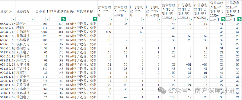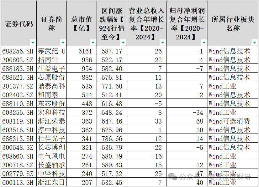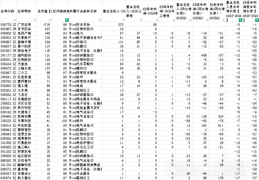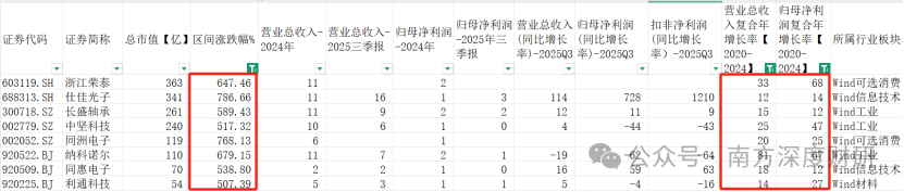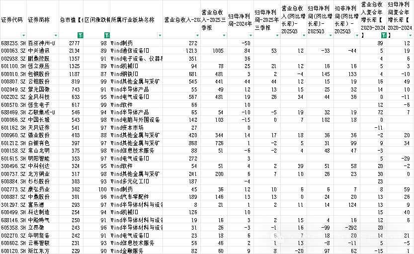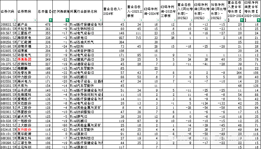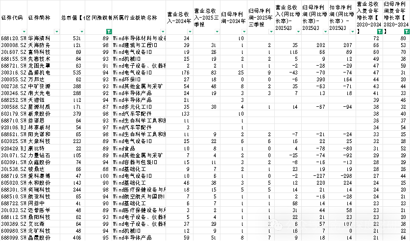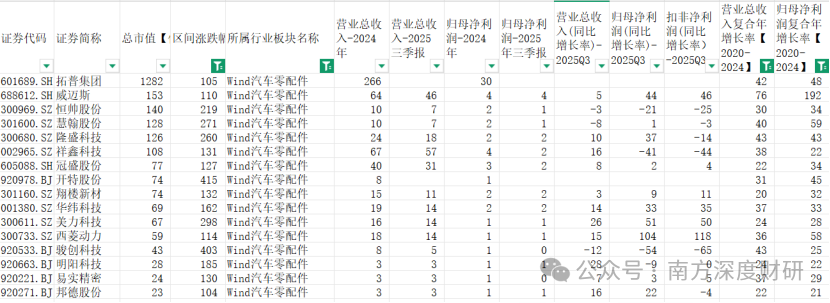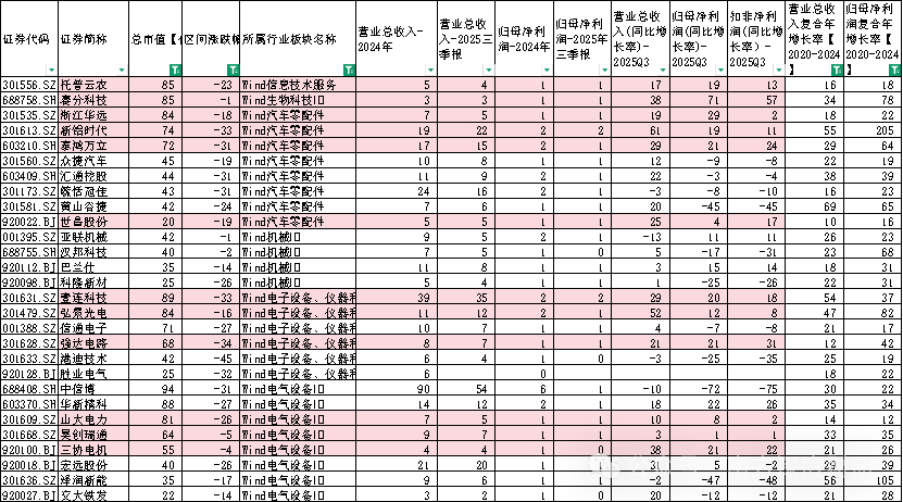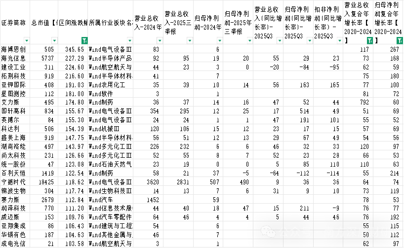 小于100亿市值的,且自2020年以来,收入及归母净利润年均复合增长率均保持在10%以上的,有51家。剔除掉一些处于传统行业的公司后,有28家,分别如下:其中,三季报为正增长的公司,多集中于汽车零配件行业。