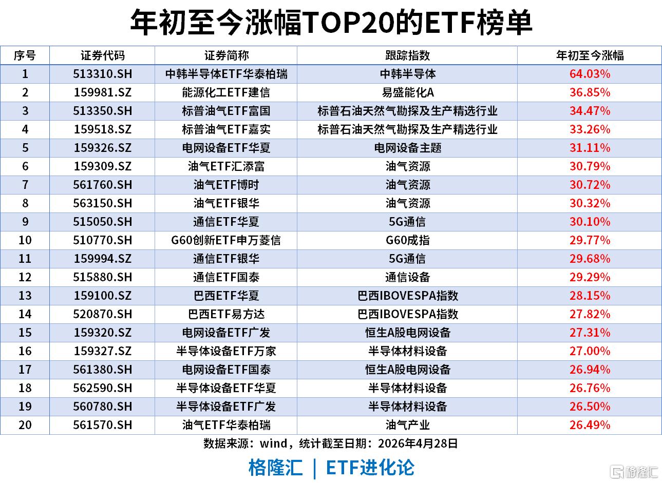年度主线格局清晰稳固,中韩半导体ETF华泰柏瑞以64.03%的涨幅登顶年度最强ETF,成为成长赛道绝对龙头。能源化工ETF建信、标普油气ETF富国、标普油气ETF嘉实涨幅均超33%,电网设备ETF华夏以31.11%位列第五,通信ETF华夏、通信ETF银华、通信ETF国泰涨幅均超29%,形成“半导体+能源+通信”的年度多主线格局。