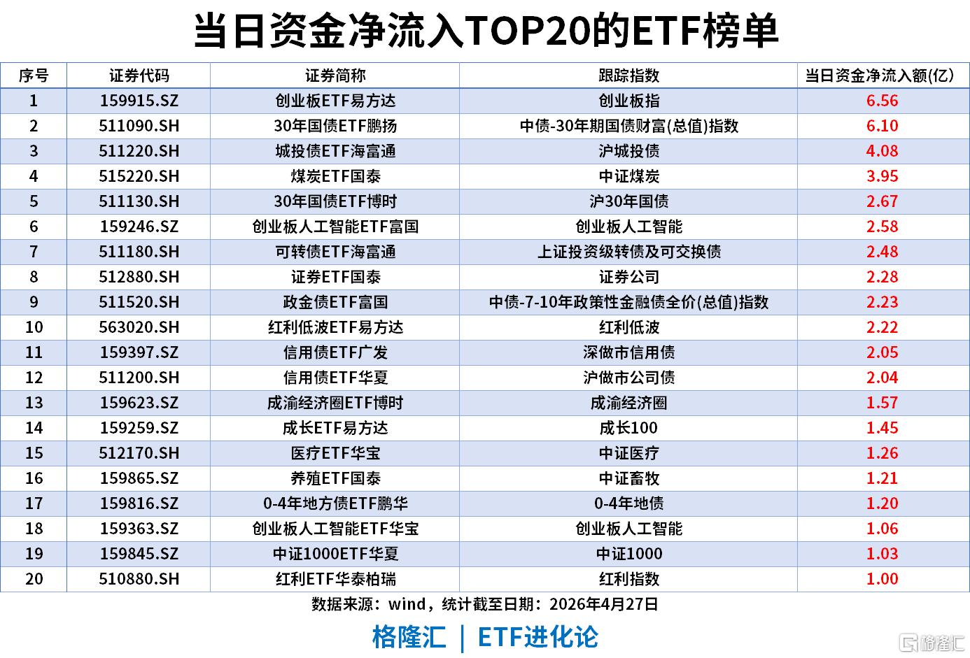 当日资金呈现宽基、固收与成长赛道并行的格局,创业板ETF易方达以6.56亿净流入领跑,30年国债ETF鹏扬、城投债ETF海富通紧随其后,分别录得6.10亿、4.08亿流入,防御性需求仍是市场重要支撑。煤炭ETF国泰、创业板人工智能ETF富国、证券ETF国泰分别流入3.95亿元、2.58亿元和2.28亿元。