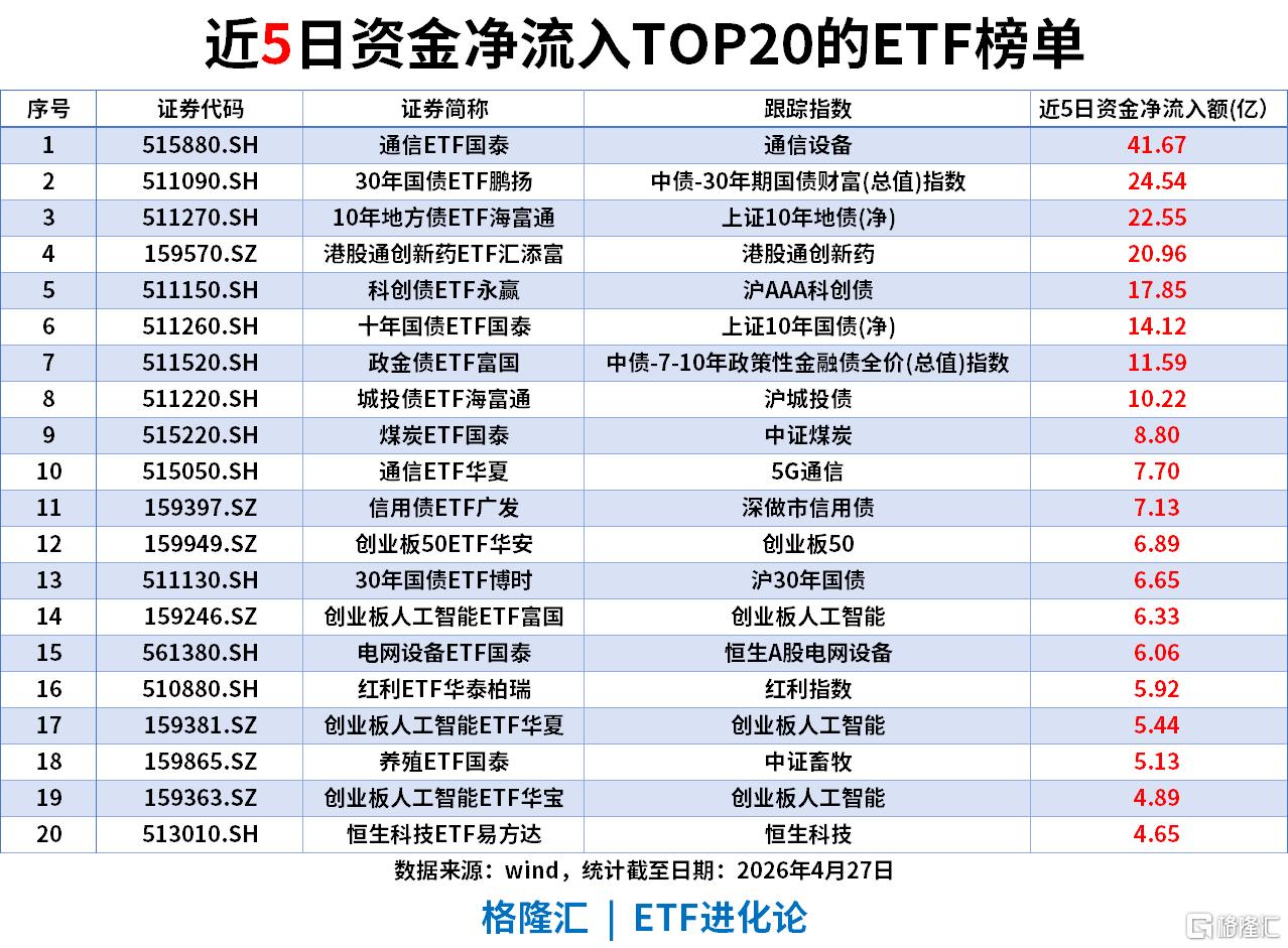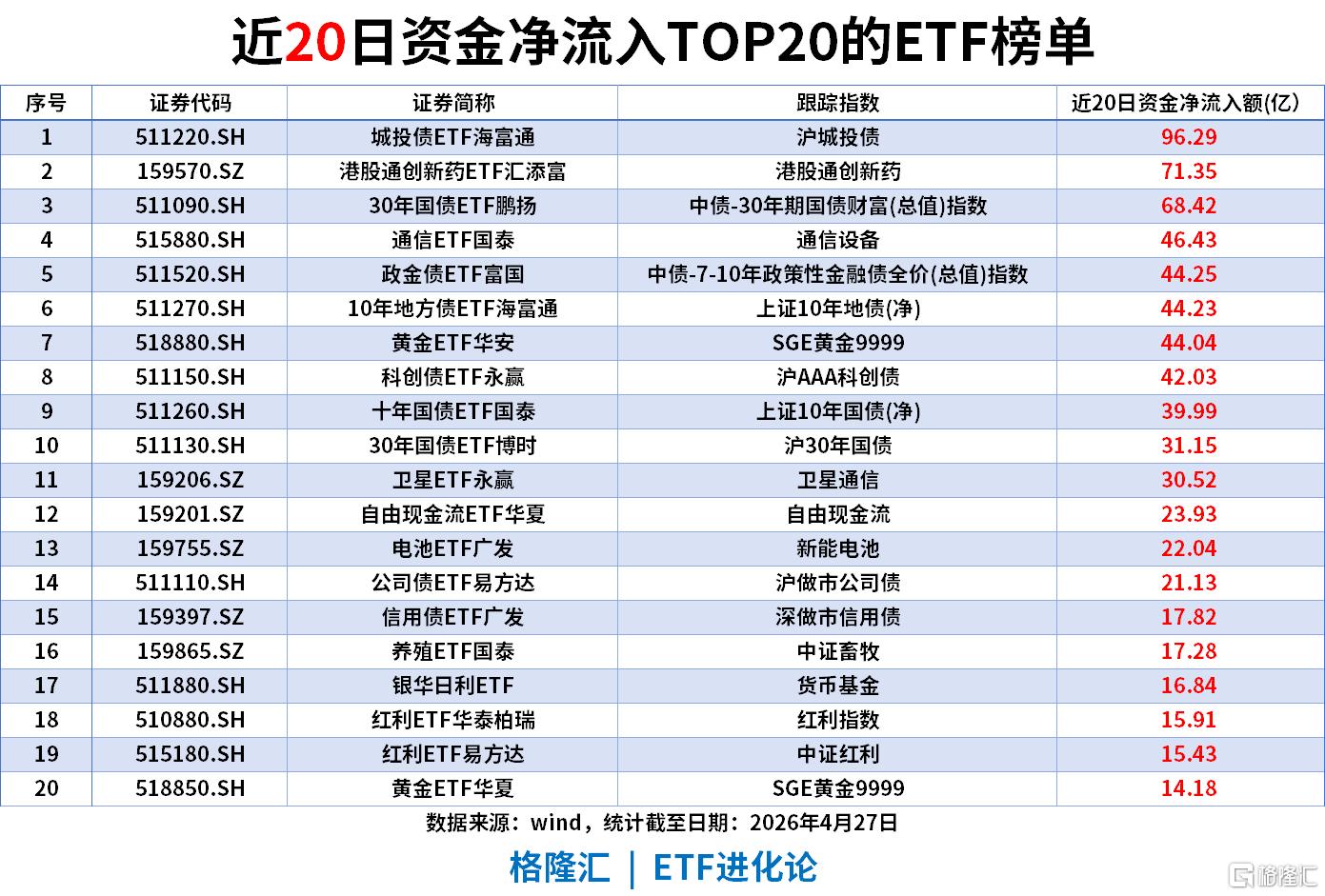 中长期资金形成固收防御、医药与科技成长均衡配置的清晰格局。城投债ETF海富通以96.29亿净流入登顶,港股通创新药ETF汇添富以71.35亿净流入位列第二,成为成长赛道中资金流入最高的品种;通信ETF国泰、黄金ETF华安、卫星ETF永赢流入46.43亿元、44.04亿元和30.52亿元。