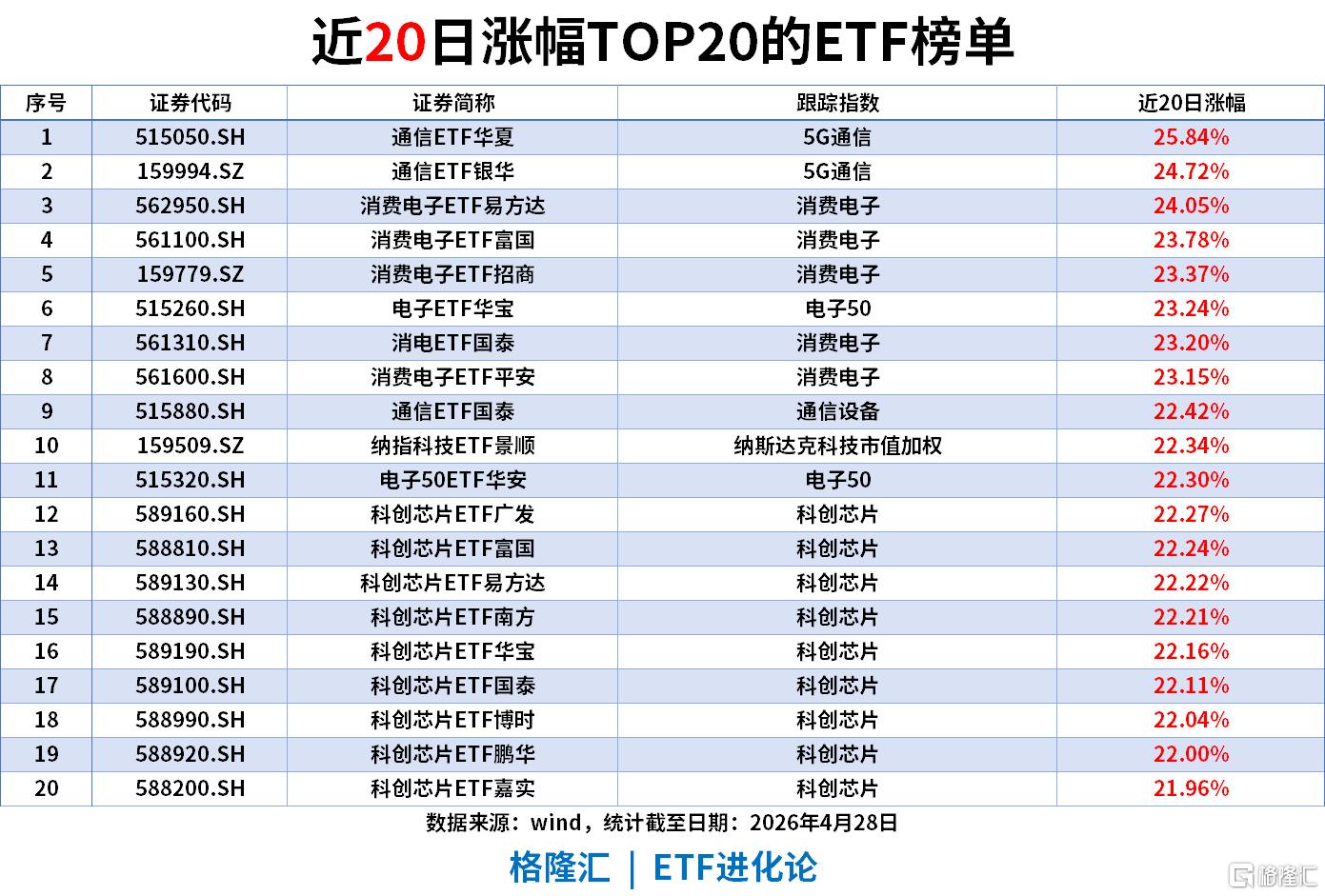 通信板块持续领涨,消费电子与科创芯片赛道同步共振,科技成长主线贯穿中期行情。通信ETF华夏以25.84%居首,消费电子ETF易方达、消费电子ETF富国、消费电子ETF招商涨幅均超235%,科创芯片ETF广发、科创芯片ETF富国亦录得20%的涨幅,市场中期风格聚焦高景气科技成长赛道。