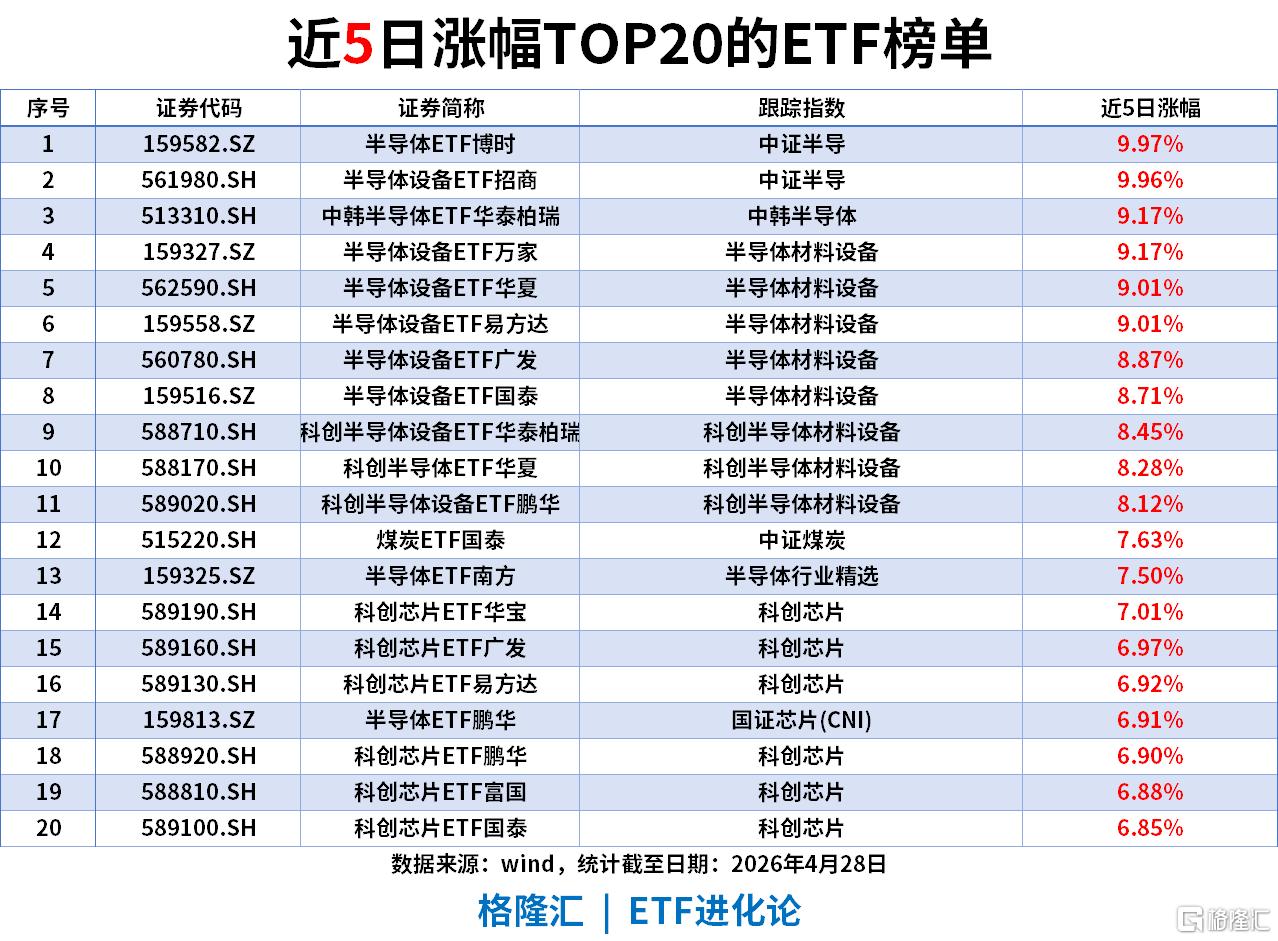 半导体板块强势领跑,全产业链呈现普涨行情。半导体ETF博时以9.97%的涨幅大幅领跑,半导体设备ETF招商、中韩半导体ETF华泰柏瑞、半导体设备ETF万家等涨超8%,煤炭ETF国泰以7.63%的涨幅位列第12位。