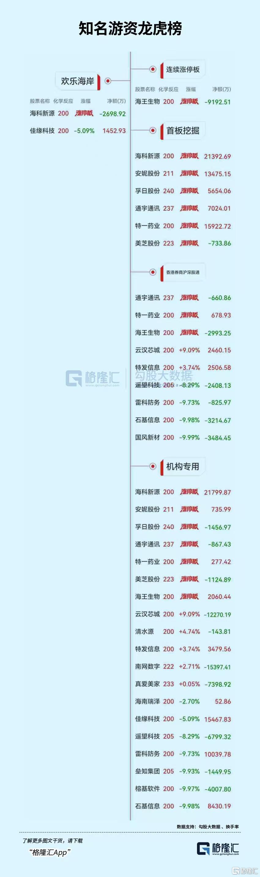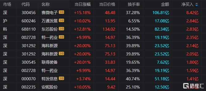 龙虎榜单日净买入额前三为海科新源、联得装备、特一药业,分别为2.14亿元、1.80亿元、1.59亿元。