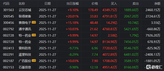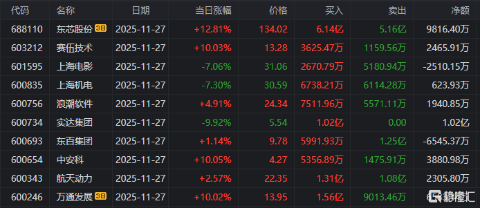 龙虎榜中涉及机构专用席位的个股中,单日净卖出额前三为南网数字、上海电影、云汉芯城,分别为8863.48万元、8686.89万元、8552.34万元。