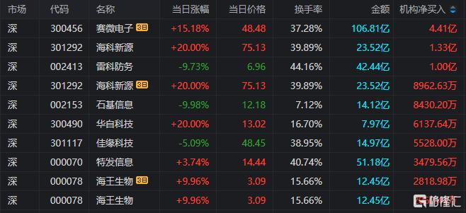 龙虎榜中涉及机构专用席位的个股中,单日净买入额前三为海科新源、雷科防务、石基信息,分别为1.33亿元、1.00亿元、8430.20万元。
