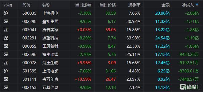 龙虎榜单日净卖出额前三为上海机电、垒知集团、真爱美家,分别为2.06亿元、1.71亿元、1.28亿元。