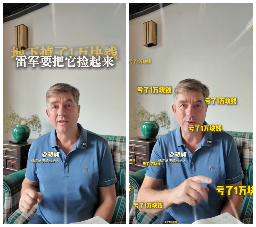 对于新晋财富“增长王”雷军,胡润前两天还在抖音上发布视频调侃:“地上掉了1万块钱,雷军要把它捡起来,那他已经亏了1万块了。”