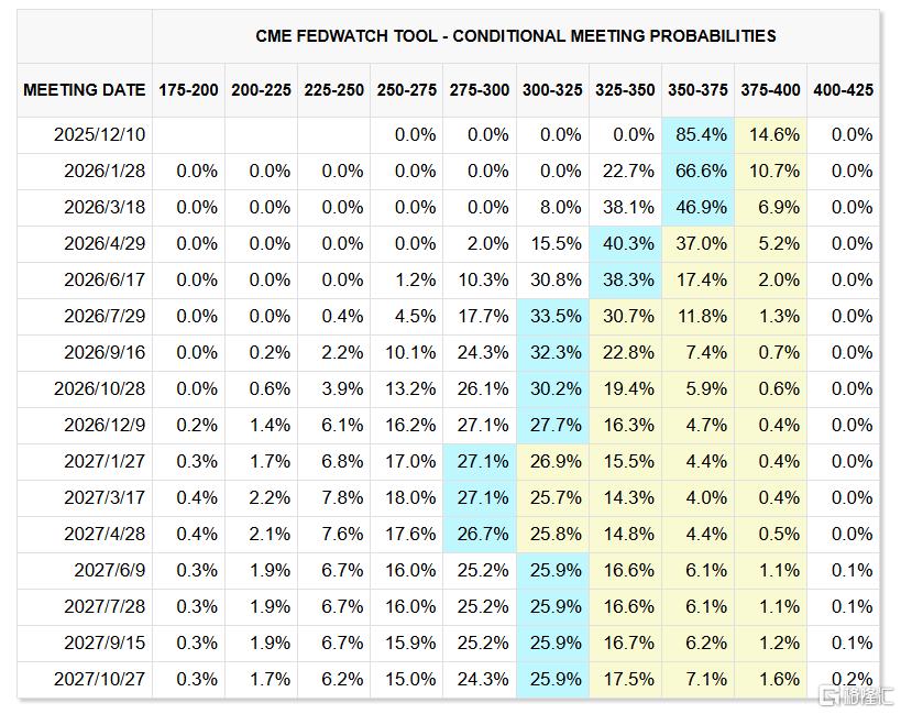 据CME“美联储观察”:美联储12月降息25个基点的概率为85.4%,高于上周的50%。美联储到明年1月累计降息25个基点的概率为66.6%,维持利率不变的概率为10.7%,累计降息50个基点的概率为22.7%。