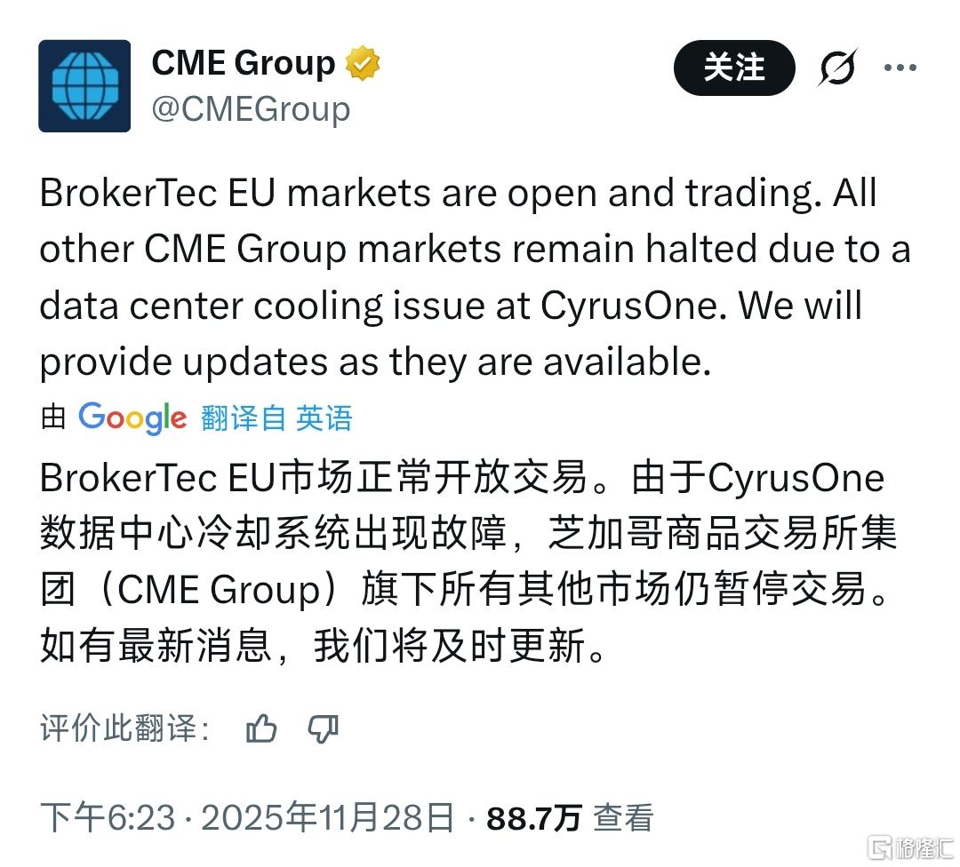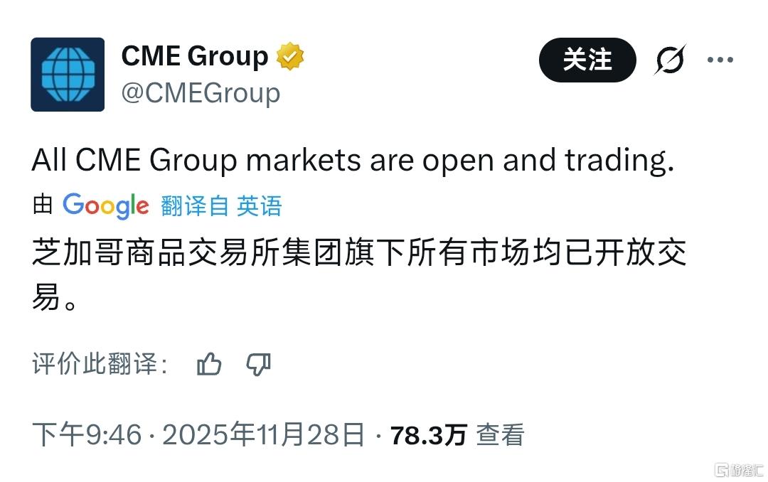 截至北京时间11月28日21点40分左右,CME公告确认所有市场已完全恢复交易,行情更新正常 。