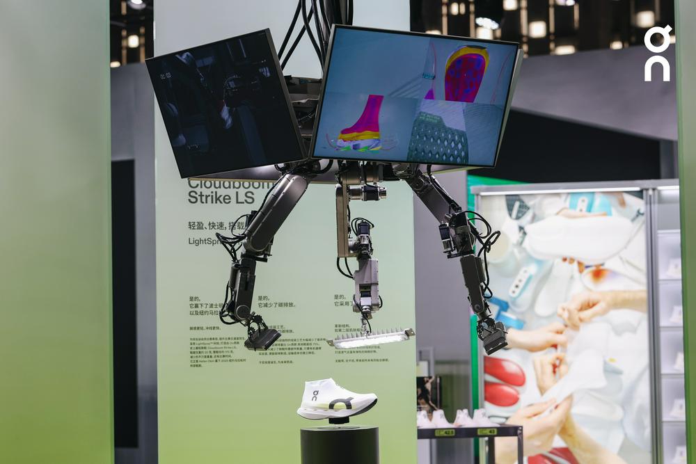 在这一产业框架下,不同品牌正在体博会上展示各自的战略路径。On昂跑通过展台设计、科技展示、产品拆解与跑者互动,系统化呈现其“专业竞速+城市跑步”的双线叙事。品牌不仅以LightSpray鞋面技术展示其技术突破,也通过机械臂喷织演示、试跑体验和限量发售的Cloudboom Strike LS,将研发能力、产品性能与跑者体验完整串联,使科技创新从产品层面延伸至全链路体验。