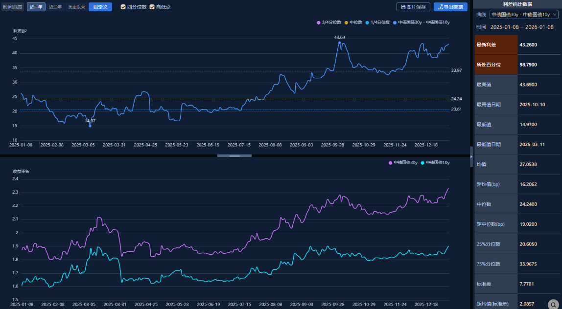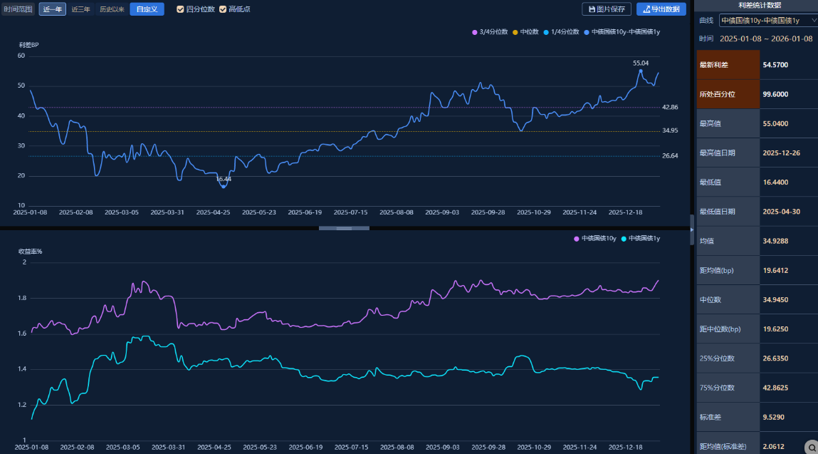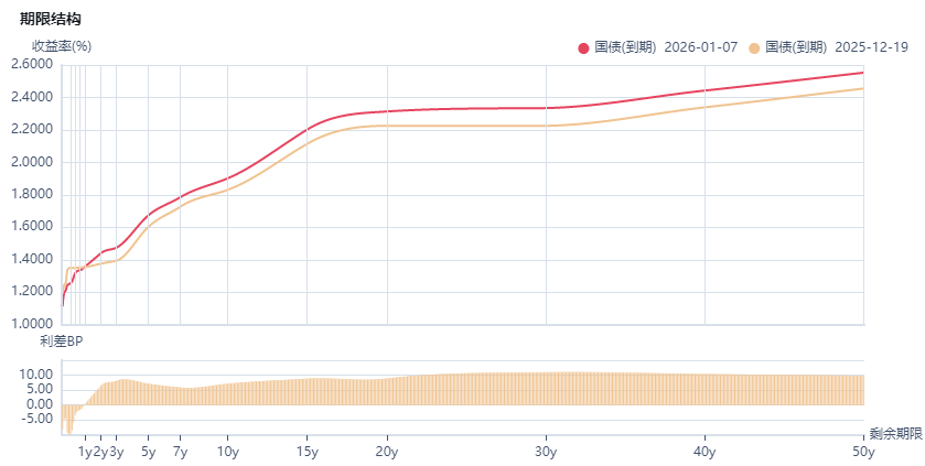 截至1月7日1Y、10Y、30Y国债中债到期收益率分别为1.3562%、1.9019%和2.3345%。从期限结构上看,短端下行较快,长端上行,曲线进一步陡。
