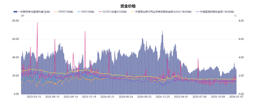 截至1月7日,资金面整体较为宽松:隔夜DR001加权为1.2674%,GC001收盘价1.6435%,R001为1.3365%;作为短券代表的1年期AAA存单与1年期国债利差为27.38bp,三年历史分位数在16.82%。银行间市场整体资金面宽松。
