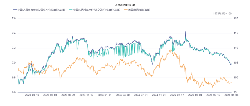 截至1月7日,在岸人民币兑美元汇率6.9908和离岸人民币兑美元汇率6.9892。主要是在美联储持续降息预期及年底集中结汇背景下,美元指数走低,人民币被动升值。