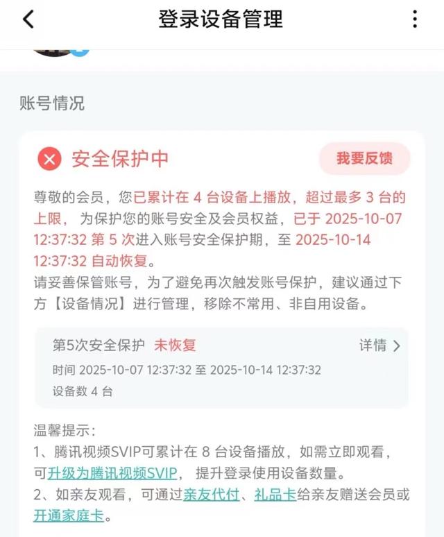 10月初,上述网友将腾讯视频“封号”会员的话题送上热搜。根据其发布的截图,其腾讯视频账号处于“安全保护中”,而原因是,其VIP账号已累计在4台设备上播放,超过最多3台的上限。平台称,为保护账号安全及会员权益,该账号于10月7日进入第4次账号保护期,至10月14日自动恢复。