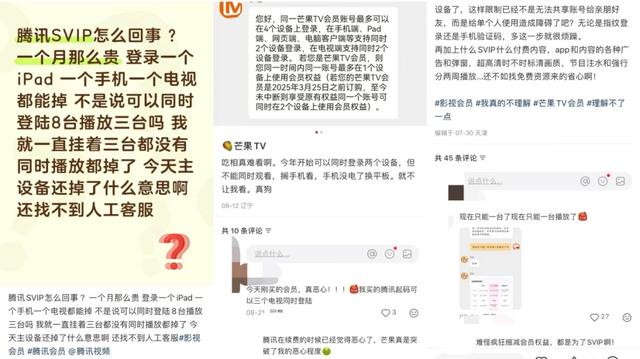 其中有网友提到,“限制设备我能理解,但手机、平板和电脑都是不同设备了,这样限制已经不是无法共享账号给亲朋好友,而是给单人使用都造成障碍了吧。”并表示,“难怪疯狂缩减会员权益,都是为了SVIP啊。”