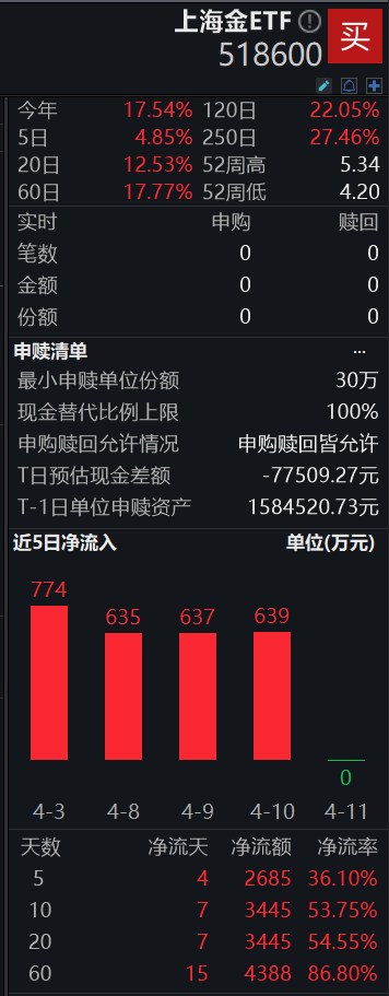 数据显示,上海金ETF(518600)近5日资金净流入超2600万元,近10日资金净流入超3400万元。