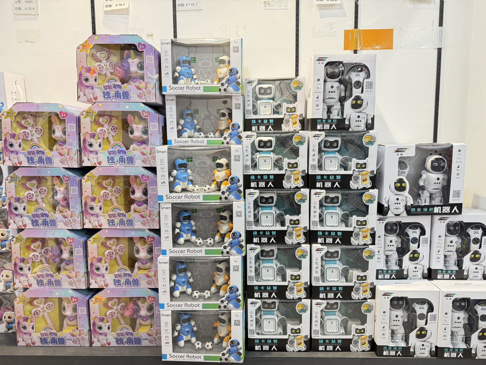 时代财经注意到,宝奥城和1688玩具品类众多,婴童玩具、积木、电玩、遥控等塑料玩具一应俱全,令人眼花缭乱的货架上,一个新兴的玩具品类尤为引人注意——AI玩具。