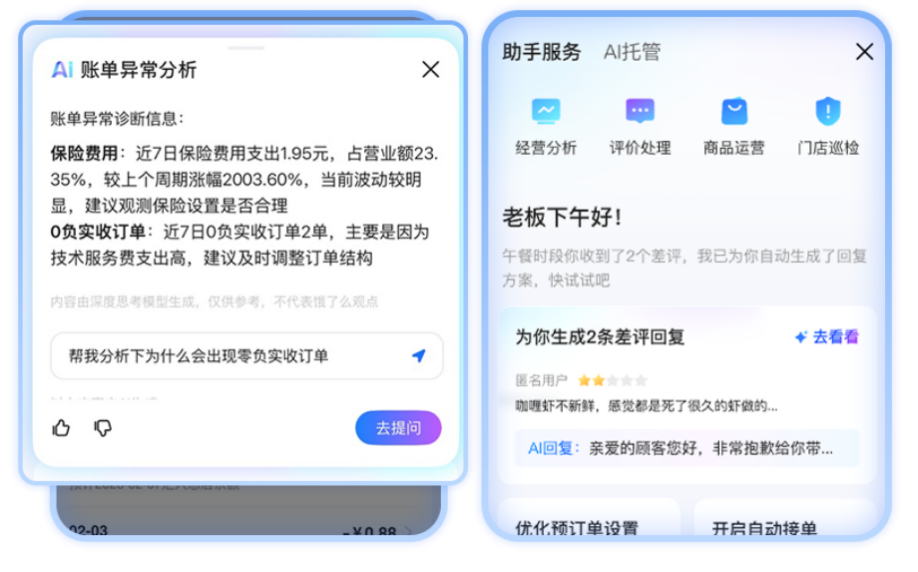 目前,AI店铺助手主动服务体系在助手首页、全局气泡以及和垂直场景联动的自嵌入AI悬浮窗等多场景支撑。服务涵盖履约、营销活动、经营成长、账单分析、顾客评价等多形态场景,覆盖商家规模已超百万。