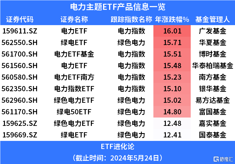 从电力指数和绿色电力指数今年的走势来看,两种走势一致,但电力指数稍胜一筹。截至5月24日,电力指数年度涨幅为16.16%,绿色电力指数同期上涨12.96%。