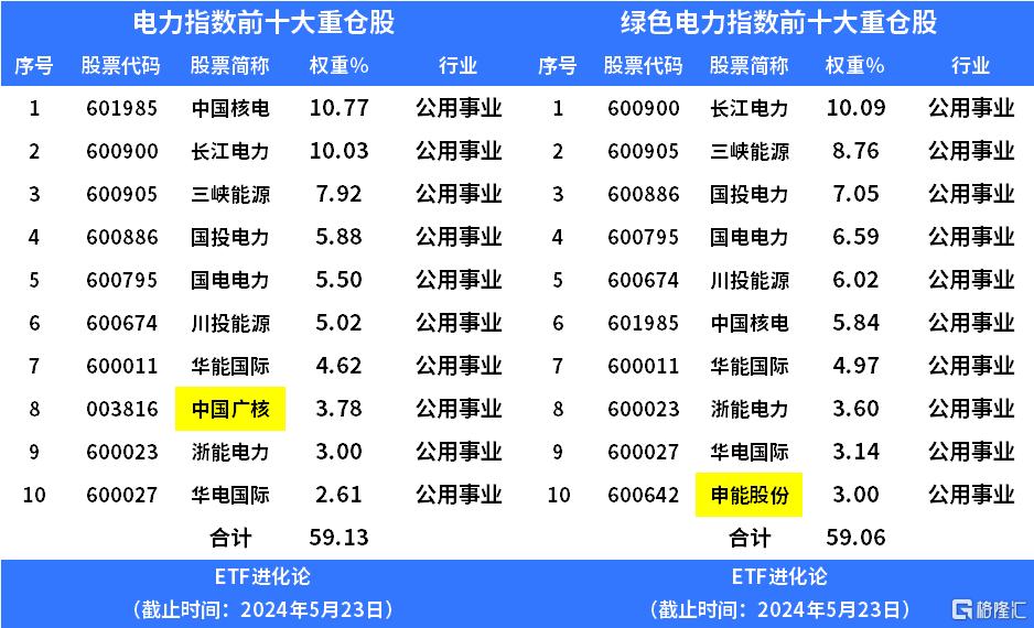 从前十大成份股来看,两种指数的成分股名单集中度相差不大,仅有一只个股不一样,电力指数前十大权重股有中国广核,绿色电力指数则是申能股份,说明两种涨幅出现差异的关键在于剩余的50%个股。绿色电力指数主要覆盖光伏、风电、水电等电力运营公司,同时也涵盖了火电转型新能源的发电商。