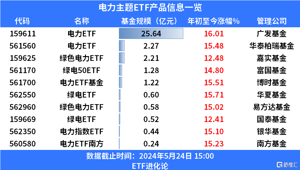 从规模来看,目前全市场规模最大的是广发基金电力ETF,最新规模为25.64亿元,跟踪的指数名称为电力指数。今日涨幅第一的是易方达基金绿色电力ETF,最新规模为5800万元,跟踪的指数名称为绿色电力指数。