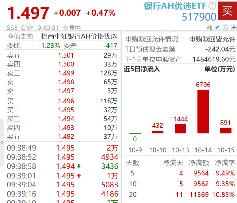 二级市场上,资金借道相关ETF布局。市场唯一可投港股银行股的银行主题ETF——银行AH优选ETF(517900)连续4日获资金净流入近1亿元。