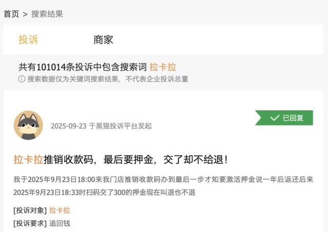 2024年6月,公安部、银保监会、最高法、央行联合下发《关于进一步规范催收行为的通知》,完善了催收的流程和要求。黑猫投诉上,关于拉卡拉的投诉量已经超过10万条。其中涉及的范围很广,比如有用户表示拉卡拉押金未退还、有用户反映拉卡拉规则存在霸王条款、也有用户认为拉卡拉的服务质量差。其中也有涉及拉卡拉小贷的暴力催收,恐吓、威胁、辱骂消费者等投诉,在新规面前,拉卡拉的催收业务似乎依然有改善空间。