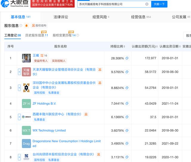 天眼查App信息显示,天瞳威视成立于2016年3月,位于江苏省苏州市。目前,该公司的注册资本为2000万元,法定代表人为王曦,主要股东包括王曦、天津天瞳智联企业管理咨询合伙企业(有限合伙)等。