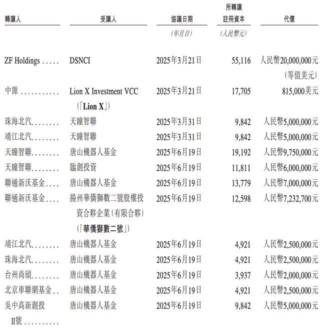 在此期间,亦有多名股东转让所持天瞳威视的股权。以2025年为例,ZF Holdings于2025年3月向DSNCI转让股份股权,代价为人民币2000万元;中源向Lion X转让股份,代价为8.15万美元;珠海北汽、靖江北汽分别向天瞳智联转让股份,均为500万元。