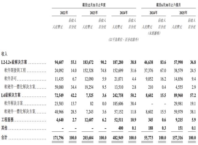 由于L4项目数量及范围大幅增加,天瞳威视2024年的L4级解决方案收入跃升至2.43亿元,占总收入的比例约为50.2%,超过L2-L2+级解决方案板块(占比38.8%),成为该公司的第一大收入来源,并在2025年上半年得以维持。